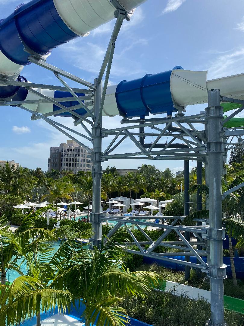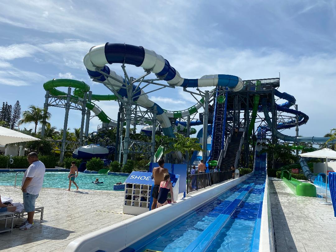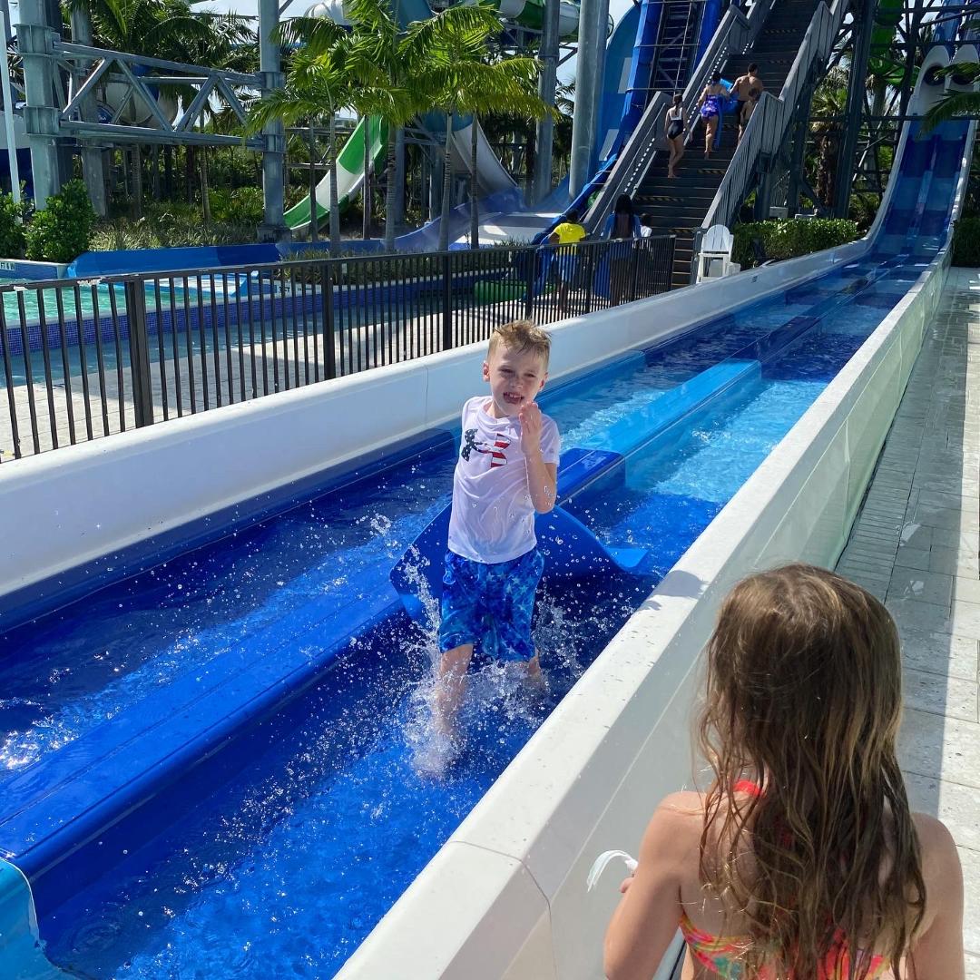 The JW Turnberry has its own private water park. Now – I will be honest. I dislike a water park, but this one is great. It has multiple slides fun for the whole family, a children’s play area for smaller kids, a surfing simulator area, a lazy river, zero-entry pool, and a bar that boasts the fastest food and beverage service imaginable. Because we are Bonvoy members, we also get to get into the water park at 8 am before it opens at 9 to choose our seats, have towels delivered, and to be sure we get to sit where we want for the day (under an umbrella and in front of the slides).