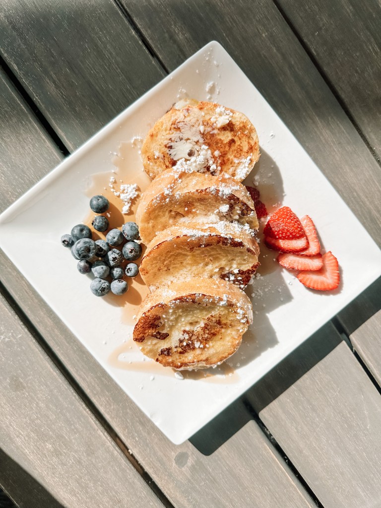 Plating your French toast is the most fun aspect of serving it. But this is where things become a little personal. Not everyone prefers every topping. I, for example, do not care for whipped cream on mine. But I do love to slice strawberries and serve my French toast with a touch of butter on each piece of bread, light maple syrup, a sprinkle of powdered sugar, and strawberries and blueberries on the side. My husband prefers his fruit on top of his French toast.